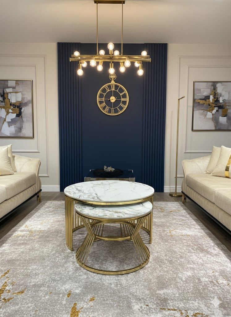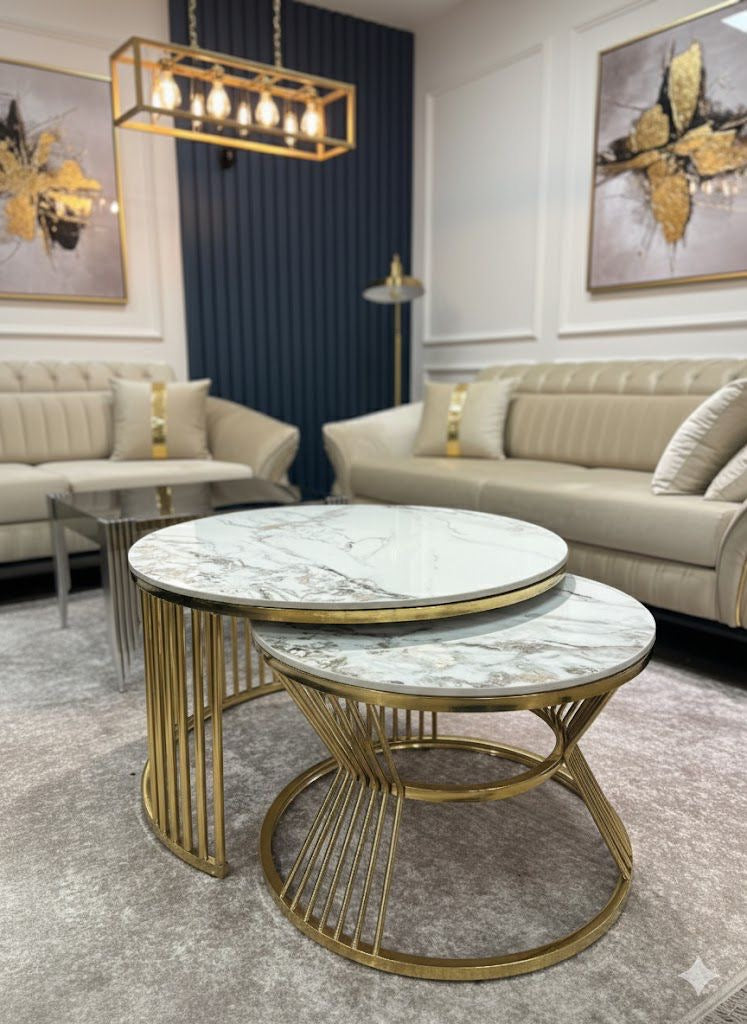 Elegant soffbordset med två runda bord i vit marmoreffekt och guldstativ. Den moderna designen med exklusiv finish skapar en lyxig känsla i vardagsrummet.