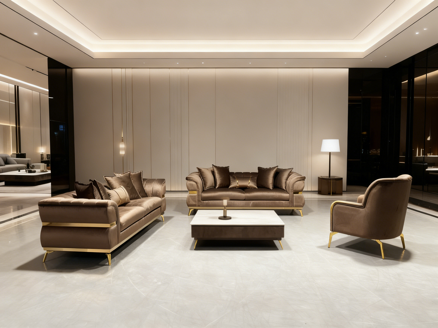 Ge ditt vardagsrum en elegant uppgradering med denna exklusiva soffgrupp i sammetsliknande tyg och gulddetaljer. Setet består av två rymlig 3-sitssoffa. Och en stilfull fåtölj – alla designade med djuphäftad stoppning som ger en sofistikerad och tidlös look.