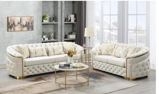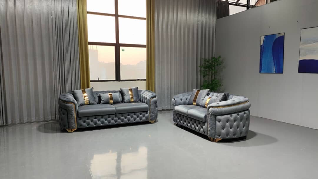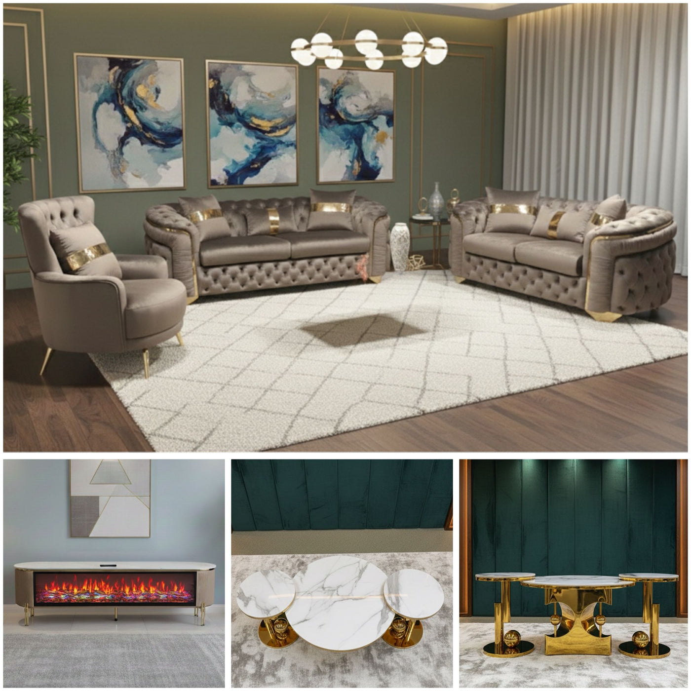 ✔️ Lyxig soffgrupp (3+3+1) med gulddetaljer