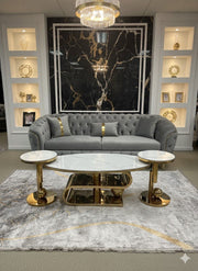 Elegant soffbord i vit marmoreffekt med exklusiva gulddetaljer. Setet inkluderar två matchande sidobord i samma lyxiga design – en perfekt kombination av stil och funktion.