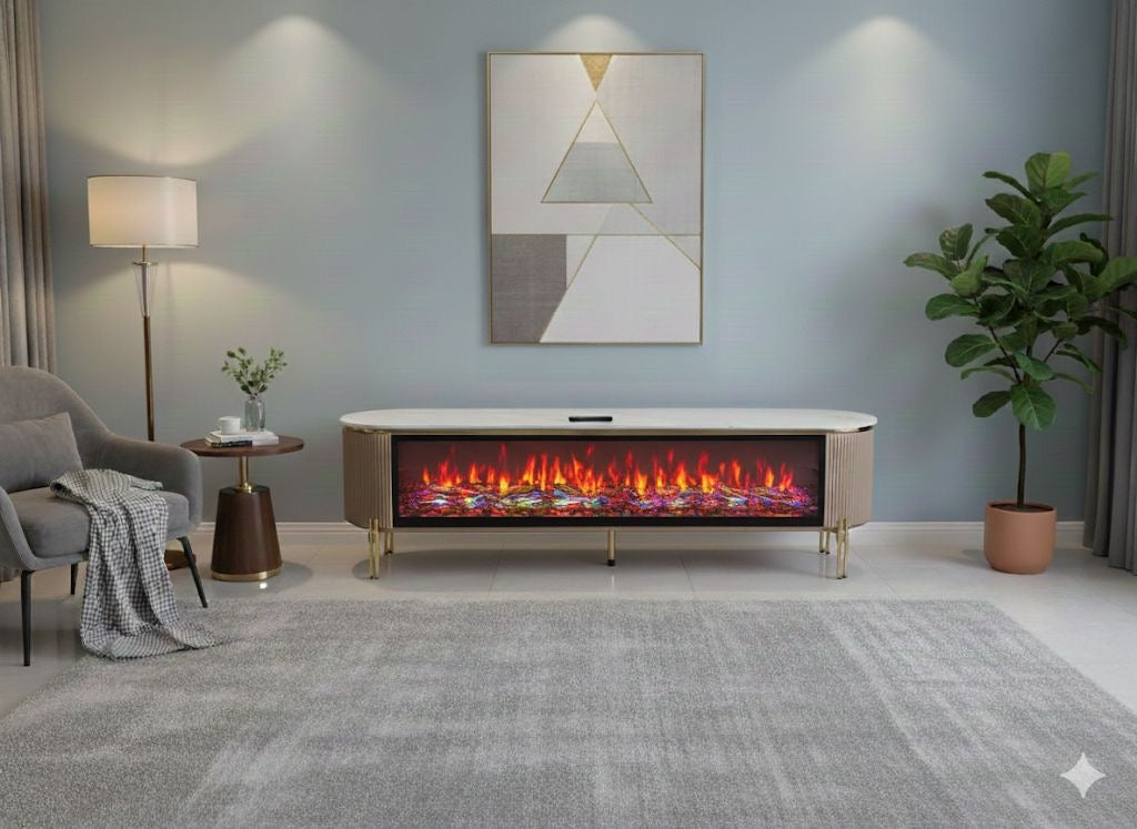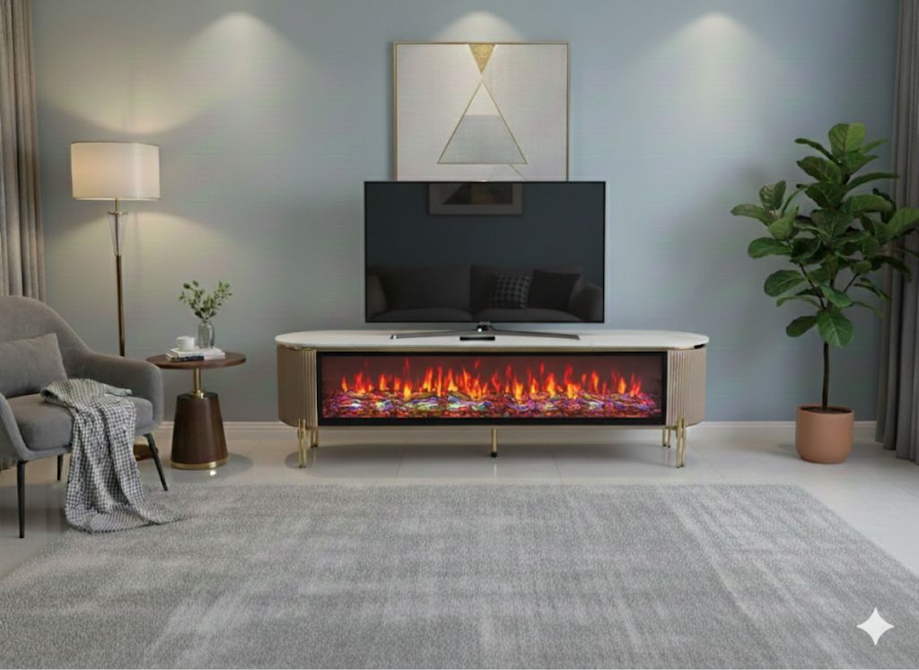 ✨ Elegant TV-bänk med inbyggd eldstad – perfekt för ett modernt hem! ✨